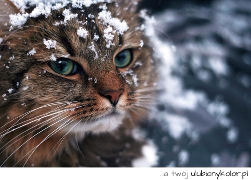 kot, śnieg, zima, zielone, oczy, bury, piękny, wąsy