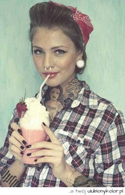 kobieta, jogurt, shake, urocza, szatynka, dziewczyna, emo, kolczyk, tatuaż, tatuaże
